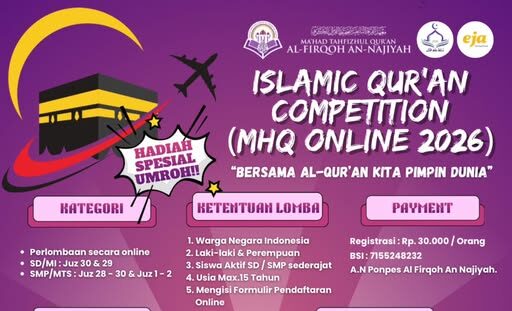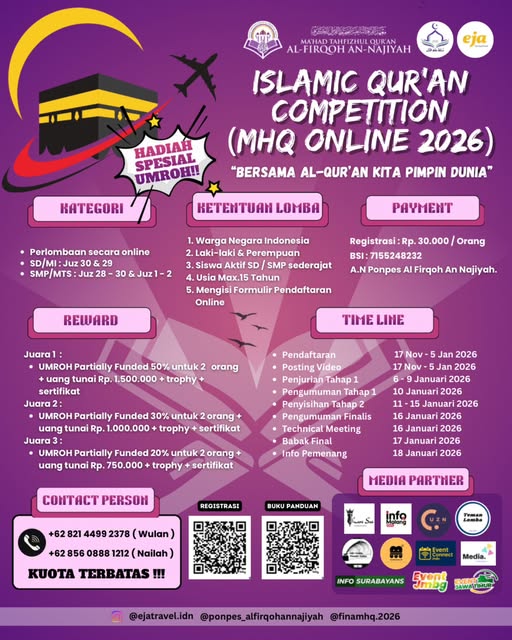 Ada sesuatu yang selalu hangat ketika berbicara tentang Al-Qur’an. Ia bukan hanya kitab suci, tetapi sahabat yang membersamai perjalanan hidup seorang muslim sejak kecil hingga dewasa. Dari halaman-halaman itulah lahir harapan, ketenangan, dan tekad untuk menjadi pribadi yang lebih baik. Tahun ini, semangat itu kembali dirayakan melalui Islamic Qur’an Competition 2026 yang digelar oleh Ma’had Tahfizhul Qur’an Al-Firqoh An-Najiyah.